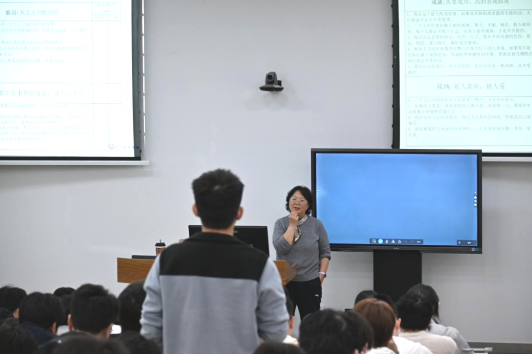 随后,李媛教授围绕“自动化思维”这一核心概念展开系统讲解。她指出,自动化思维是指个体在面对情境时自动涌现的、往往带有负面倾向的内在想法,其速度快、隐蔽性强,容易在不经意间引发焦虑、自责等情绪消耗。李教授结合丰富的案例,深入剖析了“非黑即白”“灾难化”“过度自责”等常见思维陷阱,并现场传授了“认知融合”“辩证观”等化解技巧,帮助学生在负面想法袭来时学会保持觉察、与思维建立健康距离。